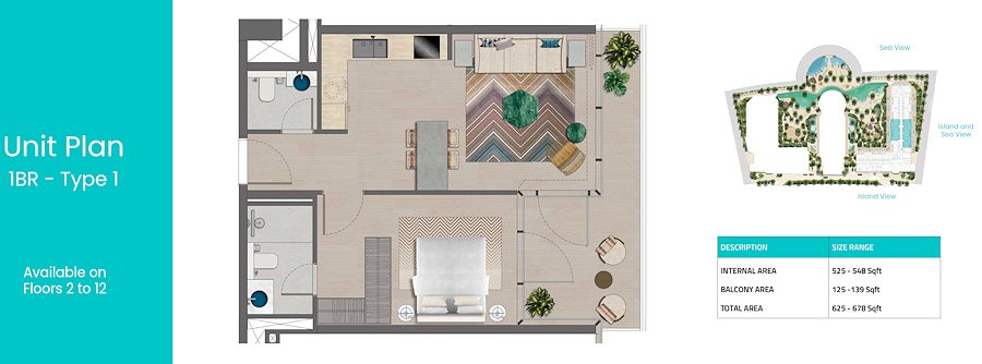Lage: im Apartmenthaus “Trio Isle” der Insel Al Marjan Island im Emirat Ras Al Khaimah der Vereinigten Arabischen Emirate